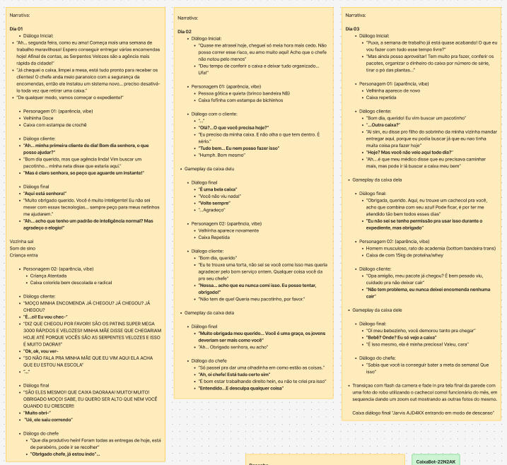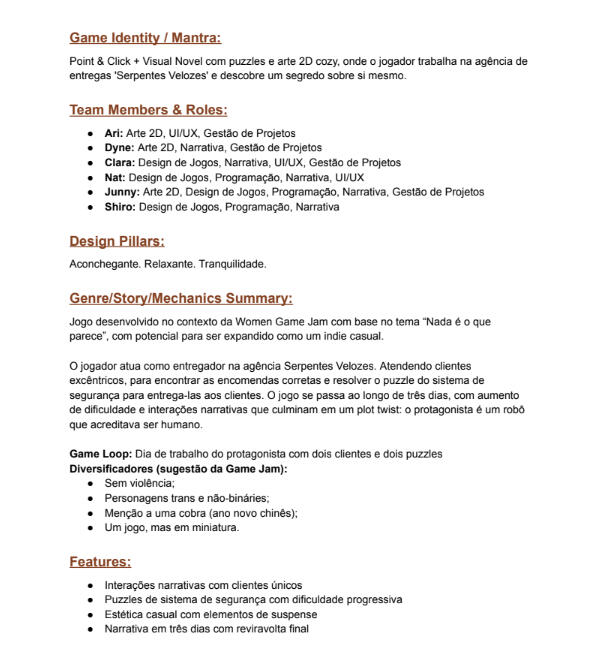 Pacoteria is a point & click + visual novel puzzle game created during the Women Game Jam 2025 under the theme “Nothing is what it seems”. The player takes on the role of a delivery worker at the quirky agency Serpentes Velozes, solving logic-based puzzles to deliver packages to eccentric clients. Over three in-game days, narrative interactions gradually reveal a surprising twist: the protagonist is not human, but a robot discovering their own identity.ㅤ• Target Audience: Players who enjoy short, narrative-driven puzzle games with cozy aesthetics (fans of visual novels, mystery plots, and casual puzzle-solving)ㅤ• The Problem: Many jam games struggle to balance narrative depth with engaging mechanics in such a limited timeframe. Our challenge was to merge storytelling with puzzles without overwhelming players or compromising accessibilityㅤ• The Goal: Create a cozy, inclusive, and engaging jam game that delivers both fun puzzles and a meaningful narrative payoff while fitting the Game Jam themeThe game combines warm 2D visuals, puzzle-solving, and narrative suspense in a non-violent, character-driven experience.