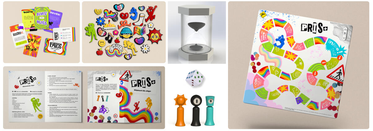 Delivered Components:ㅤ• Board: 40x40cm, vibrant rainbow-themed design with action housesㅤ• Cards: Three decks (56x87mm) with conflict scenarios, LGBTQIA+ facts, and chance eventsㅤ• Tokens: 3D-printed peões (Sol, Phill, Void) and stickers as rewardsㅤ• Manual: A4 guide with rules and objectives